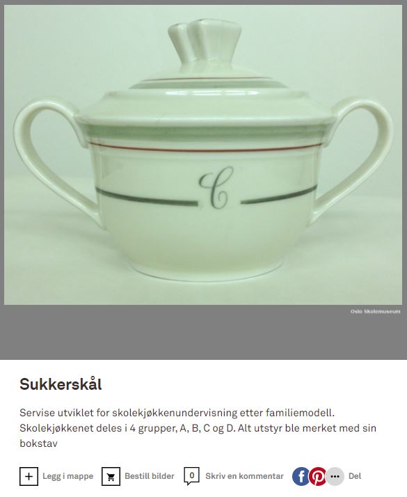 Oslo Skolemuseum sin samling består av skolehistoriske gjenstander som læremidler, elevarbeider og skoleinventar, samt lærerbøker og pedagogisk litteratur. Museets gjenstander er i hovedsak fra slutten av 1800-tallet til i dag. Sukkerskålen på bildet under er en del av et servise designet av Nora Gulbrandsen for Porsgrund porselen. Serien var i produksjon mellom 1935 og 1955. Servise ble utviklet for skolekjøkkenundervisning etter familiemodellen. Modellen går ut på å dele skolekjøkkenet i 4 like grupper: A, B, C og D. Alt utstyr ble merket med sin bokstav. Se resten av serviset på DigitaltMuseum.